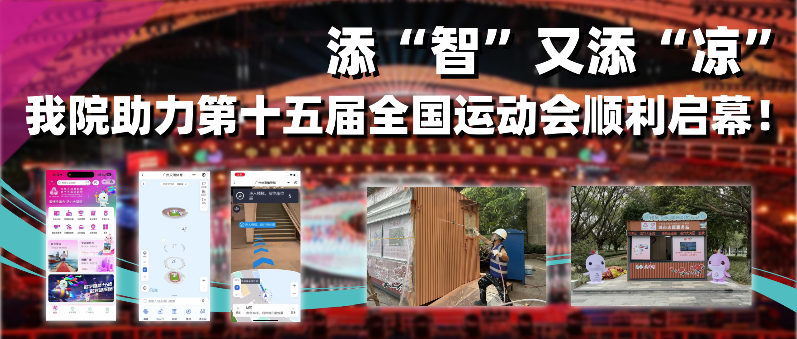 日前,第十五届全国运动会开幕式在广东奥体中心盛大开幕,这场粤港澳三地首次联合承办的国家级体育盛事,正式拉开“体育+科技+城市”深度融合的序幕。开幕当天,我院为广东奥体中心提供室内定位导航保障工作,通过定时定点查看导航程序运行状态,确保入场观众导航服务使用流畅;场馆外,我院为志愿者服务驿站披上“防晒降温外衣”,保障赛事、文体活动和日常人流服务工作有序进行。